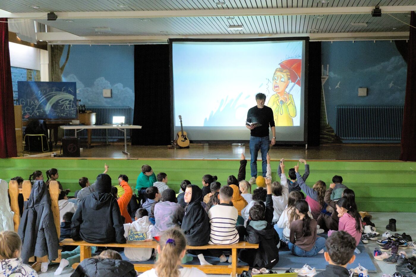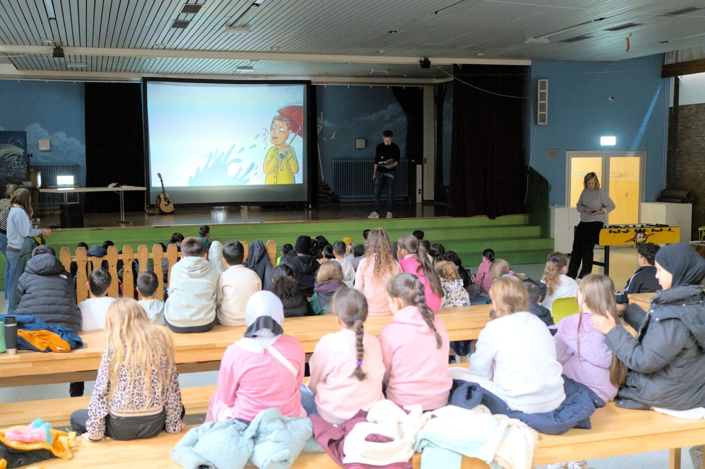 Gestern laß der Autor Michael Petrowitz vor mehreren Klassen in einer Weltpremiere aus seinem neuen Buch „Die unendliche Klassenfahrt“. Darin geht es um eine Schulklasse, deren Schulbus ein Portal in Parallelwelten ist womit die Schüler dann im Mittelalter landen.