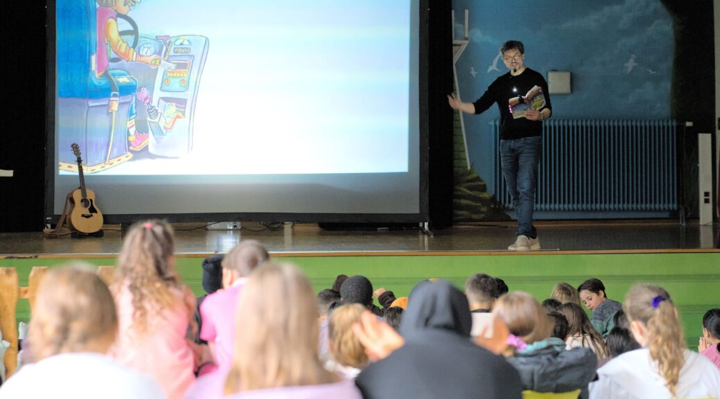 Gestern laß der Autor Michael Petrowitz vor mehreren Klassen in einer Weltpremiere aus seinem neuen Buch „Die unendliche Klassenfahrt“. Darin geht es um eine Schulklasse, deren Schulbus ein Portal in Parallelwelten ist womit die Schüler dann im Mittelalter landen.